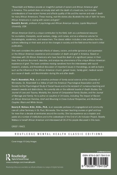 African American Grief is a unique contribution to the field, both as a professional resource for counselors, therapists, social workers, clergy, and nurses, and as a reference volume for thanatologists, academics, and researchers. The classic edition includes a new preface from the authors reflecting on their work and on the changes in society and the field since the book's initial publication. This work considers the potential effects of slavery, racism, and white ignorance and oppression on the African American experience and conception of death and grief in America. Based on interviews with 26 African Americans who have faced the death of a significant person in their lives, the authors document, describe, and analyze key phenomena of the unique African American experience of grief. The book combines moving narratives from the interviewees with sound research, analysis, and theoretical discussion of important issues in thanatology, as well as topics such as the influence of the African American church, gospel music, family grief, medical racism as a cause of death, and discrimination during life and after death.