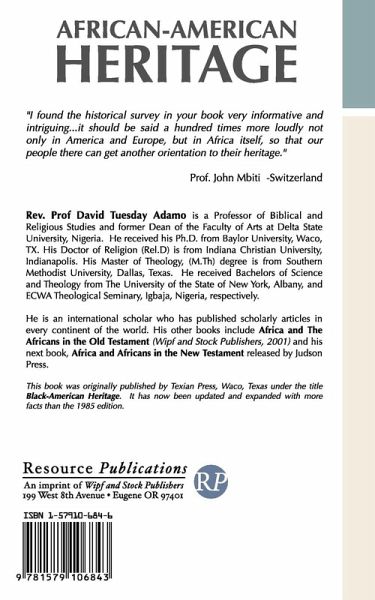 Rev. Prof David Tuesday Adamo is a Professor of Biblical and Religious Studies and former Dean of the Faculty of Arts at Delta State University, Abraka, Delta State, Nigeria. He received his Ph.D. from Baylor University, Waco, TX. His Doctor of Religion (Rel.D) is from Indiana Christian University, Indianapolis. His Master of Theology, (M.Th) degree is from Southern Methodist University, Dallas, Texas. He received Bachelors of Science and Theology from The University of the State of New York, Albany, and ECWA Theological Seminary, Igbaja, Nigeria, respectively. He is an international scholar who has published scholarly articles in every continent of the world. His other books include African American Heritage (Wipf and Stock Publishers, 2001), Africa and The Africans in the Old Testament (Wipf and Stock Publishers, 2001). His next book, Africa and Africans in the New Testament is in print soon to be released by Judson Press.
