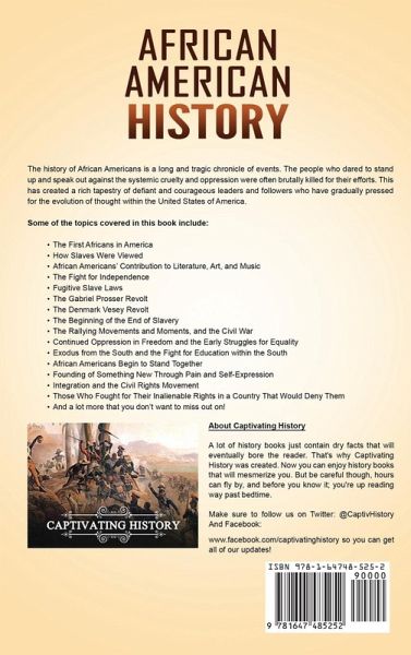 Explore Captivating Stories and Facts about African American History! The history of African Americans is a long and tragic chronicle of events. The people who dared to stand up and speak out against the systemic cruelty and oppression were often brutally killed for their efforts. This has created a rich tapestry of defiant and courageous leaders and followers who have gradually pressed for the evolution of thought within the United States of America. Discover personal stories, struggles and achievements of people like: Harriet Tubman Martin Luther King, Jr. Malcolm X Rosa Parks Frederick Douglass And many more Some of the topics covered in this book include: The First Africans in America How Slaves Were Viewed African Americans’ Contribution to Literature, Art, and Music The Fight for Independence Fugitive Slave Laws The Gabriel Prosser Revolt The Denmark Vesey Revolt The Beginning of the End of Slavery The Rallying Movements and Moments, and the Civil War Continued Oppression in Freedom and the Early Struggles for Equality Exodus from the South and the Fight for Education within the South African Americans Begin to Stand Together Founding of Something New Through Pain and Self-Expression Integration and the Civil Rights Movement Those Who Fought for Their Inalienable Rights in a Country That Would Deny Them And a Great Deal More that You don't Want to Miss out on! Get the book now and learn more about African American History!