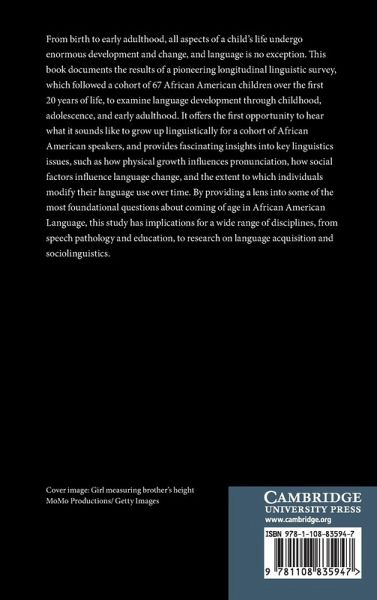 List of Figures List of Tables Preface Abbreviations 1. Coming of Age in African American Language 2. The Analysis of Sociolinguistic Change over the Lifespan 3. Profiles of Change: The Early Lifespan of African American Language 4. Vowel Variation across Time and Space 5. Caretaker's Influence on Vernacularity 6. The Influence of Peers on the Use of African American Language 7. Stylistic Variation in the Early AAL Lifespan 8. The Relationship of African American Language and Early Literacy Skills 9. A Longitudinal Study in Retrospect.