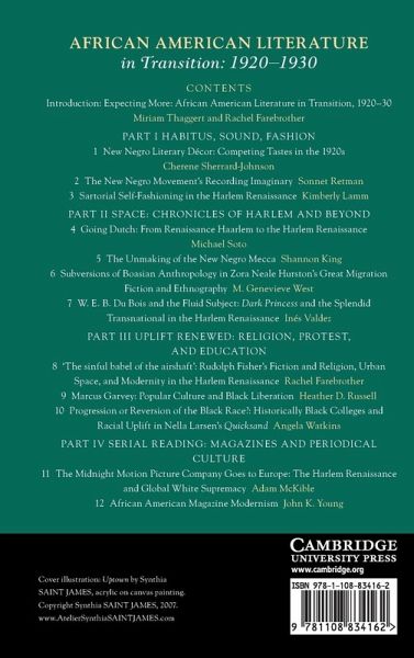 Introduction: Expecting more: African American literature in transition, 1920-30 Miriam Thaggert and Rachel Farebrother; Part I. Habitus, Sound, Fashion: 1. New Negro literary décor: Competing tastes in 1920s Cherene Sherrard-Johnson; 2. The new Negro movement's recording imaginary Sonnet Retman; 3. Sartorial self-fashioning in the Harlem renaissance Kimberly Lamm; Part II. Space: Chronicles of Harlem and Beyond: 4. Going Dutch: From renaissance Haarlem to the Harlem renaissance Michael Soto; 5. The unmaking of the new Mecca Shannon King; 6. Subversions of Boasian objectivity in Zora Neale Hurston's great migration fiction and ethnography M. Genevieve West; 7. W. E. B. Du Bois and the fluid subject: Dark princess and the splendid transnational in the Harlem renaissance Inés Valdez; Part III. 'Uplift' Renewed: Religion, Protest and Education: 8. 'The sinful babel of the airshaft': Rudolph fisher's fiction and religion, urban space and modernity in the Harlem renaissance Rachel Farebrother; 9. Marcus Garvey: Popular culture and black liberation Heather D. Russell; 10. Progression or reversion of the black race?: Historically black colleges in Nella Larsen's Quicks and Angela Watkins; Part IV. Serial Reading: Magazines and Periodical Culture: 11. The midnight motion picture company goes to Europe: The Harlem renaissance and global white supremacy Adam McKible; 12. African American magazine modernism John K. Young.