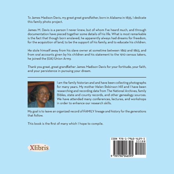 To James Madison Davis, my great great grandfather, born in Alabama in 1835, I dedicate this family photo project. James M. Davis is a person I never knew, but of whom I've heard much, and through documentation have pieced together some details of his life. What is most remarkable is the fact that though born enslaved, he apparently always had dreams for freedom, for the acquisition of land, to be the support of his family, and to educate his children. He stole himself away from his slave owner at sometime between 1862 and 1863, and from oral accounts given by his children and his statement to the 1910 census takers, he joined the (UA) Union Army. Thank you great, great grandfather James Madison Davis for your fortitude, your faith, and your persistence in pursuing your dream.