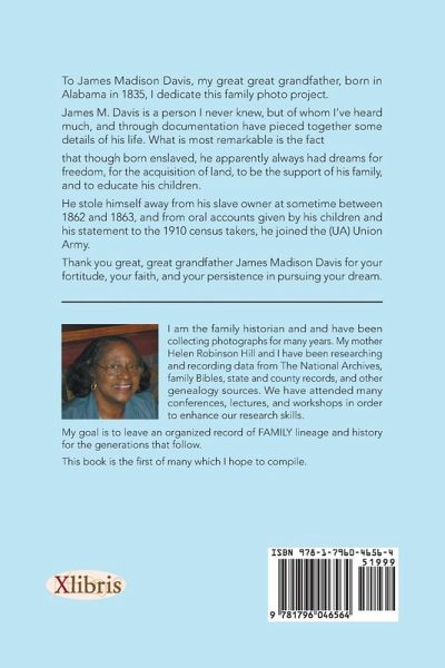 To James Madison Davis, my great great grandfather, born in Alabama in 1835, I dedicate this family photo project. James M. Davis is a person I never knew, but of whom I've heard much, and through documentation have pieced together some details of his life. What is most remarkable is the fact that though born enslaved, he apparently always had dreams for freedom, for the acquisition of land, to be the support of his family, and to educate his children. He stole himself away from his slave owner at sometime between 1862 and 1863, and from oral accounts given by his children and his statement to…mehr