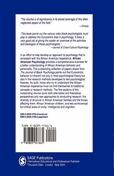 This volume provides a comprehensive overview of research on the psychology of African Americans. Topics discussed include testing and measurement issues, child development, social behaviour, education, cognition, physiological functioning and clinical applications. The articles were previously published in The Journal of Black Psychology.