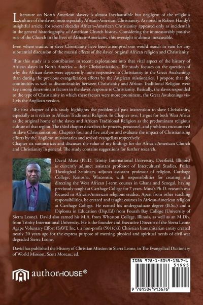 Literature on North American slavery is almost inexhaustible but negligent of the religious culture of the slaves, most especially African-American Christianity. As noted in Robert Handy's insightful article, for several decades African-American Christianity appeared only as incidentals in the general historiography of American Church history. Considering the immeasurably positive role of the Church in the lives of African-Americans, this oversight is almost inexcusable. Even where studies in slave Christianity have been attempted one would search in vain for any substantial discussion of the mutual effects of the slaves' original African religion and Christianity. Thus this study is a contribution to recent explorations into that vital aspect of the history of African slaves in North America - their Christianization. The study focuses on the question of why the African slaves were apparently more responsive to Christianity in the Great Awakenings than during the previous evangelization efforts by the Anglican missionaries. I propose that the continuities as well as discontinuities between Christianity and African Traditional Religion were key among determinant factors in the slaves' response to Christianity. Basically, the slaves responded to the type of Christianity in which these factors were more prominent, the Great Awakenings vis-à-vis the Anglican version. The first chapter of this study highlights the problem of past inattention to slave Christianity, especially as it relates to African Traditional Religion. In Chapter two, I argue for both West Africa as the original home of the slaves and African Traditional Religion as the predominant religious culture of that region. The third chapter describes the process, personnel, and problems encountered in slave Christianization. Chapters four and five analyze and evaluate the impact of Christianizing efforts by the Anglican missionaries and revival evangelists respectively. Chapter six summarizes and discusses the value of my findings for the African-American Church and Christianity in general. The study contains suggestions for further research.