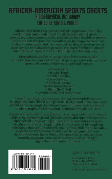 African-American athletes have played a significant role in the development and popularity of American professional sports, and have encountered numerous obstacles on the road to athletic success. This is the first comprehensive multi-sport biographical dictionary of African Americans who reached the pinnacles of success in their sport. It contains more personal and career profiles of African-American sports greats than are found in any other single source. Biographical profiles of 166 noted athletes, coaches, and administrators in team and individual sports include both Ristorical figures such as Jesse Owens and Satchel Paige and contemporary stars such as Charles Barkley, Ken Griffey, Jr., Michael Jordan, Jackie Joyner-Kersee, Shaquille O'Neal, and Emmitt Smith. Forty-four sports historians contributed the colorfully written biographies, which blend both personal background information and athletic career accomplishments. All information is current through the middle of 1995. The dictionary covers the contributions made by African-American greats in football, baseball, basketball, track and field, boxing, wrestling, auto and stock car racing, golf, thoroughbred racing, tennis, cycling, and figure skating. More than two-thirds of the entries represent team sports. The dictionary is organized alphabetically by person. Each colorfully written profile is 800-1,000 words in length and traces the subject's personal life, family and educational background, personal struggles, career accomplishments, records set, statistical data, awards and honors, and overall impact; and features lively quotations by and about the sports luminaries. Each entry contains a handy bibliography of books and articles about the subject. Biographies of managers, coaches, and club executives describe their teams, statistical achievements, accomplishments, strategy, and sports impact. A general introduction traces the historic struggle of African-American athletes in professional and Olympic sports and appendices provide alphabetical listings of biographical entries and entries by sport. A selection of photos complement the profiles. For the sports fan or librarian, this is a first stop for biographical information that captures the personality of the athlete and includes all the pertinent information about his or her accomplishments. It is an essential addition to the reference sections of junior high, high school, and public libraries.