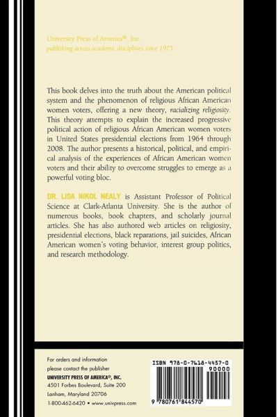 This is a book about the American political system and the phenomenon of religious African American women voters, offering a new theory, racializing religiosity. This theory attempts to explain the increased progressive political action of religious African American women voters in United States presidential elections from 1964 through 2008.