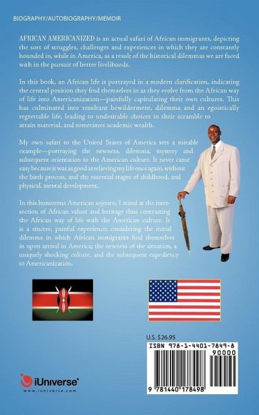 AFRICAN AMERICANIZED is an actual Safari of African immigrants, depicting the sort of struggles, challenges and experiences in which they are constantly hounded in, while in America, as a result of the historical dilemmas we are faced with in the pursuit of better livelihoods. In this book, an African life is portrayed in a modern clarification, indicating the central position they find themselves in as they evolve from the African way of life into Americanization-painfully capitulating their own cultures. This has culminated into resultant bewilderment, dilemma and an egoistically regrettable life, leading to undesirable choices in their scramble to attain material, and sometimes academic wealth. My own Safari to the United States of America sets a suitable example-portraying the newness, dilemma, mystery and subsequent orientation to the American culture. It never came easy because it was as good as relieving my life once again, without the birth process-and the essential stages of childhood, and physical, mental development. In this humorous American Safari, I stand at the inter-section of African values and heritage thus contrasting the African way of life with the American culture. It is a sincere, painful experience-considering the initial dilemma in which African immigrants find themselves in upon arrival in America; the newness of the situation, a uniquely shocking culture, and the subsequent orientation to Americanization.