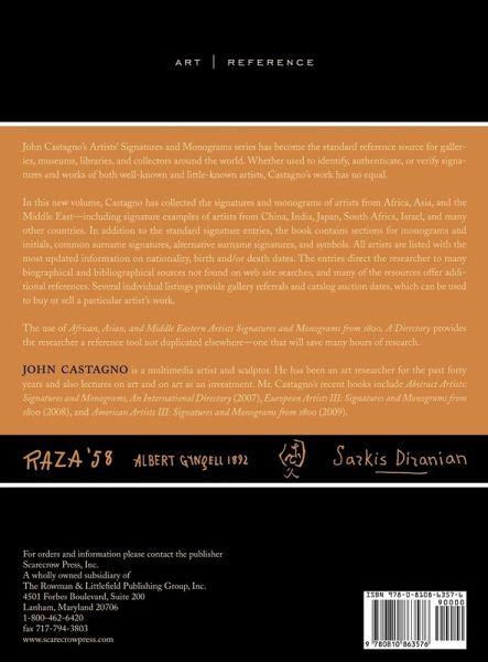 John Castagno's Artists' Signatures and Monograms have become the standard reference source for galleries, museums, libraries, and collectors around the world. In African, Asian and Middle Eastern Artists Signatures and Monograms From 1800: A Directory, Castagno has collected the signatures and monograms of artists from Africa, Asia, and the Middle East-including signature examples of artists from China, India, Japan, South Africa, Israel, and many other countries. In addition to the standard signature entries, the book contains sections for monograms and initials, common surname signatures, alternative surname signatures, and symbols. It provides the researcher a reference tool not duplicated elsewhere-one that will save many hours of research.
