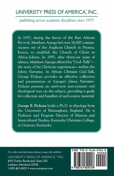 In 1957, during the fervor of the East African Revival, Matthew Ajuoga led over 16,000 communicants out of the Anglican Church in Nyanza, Kenya, to establish the Church of Christ in Africa-Johera. In 1993, after thirty-six years of silence, Matthew Ajuoga offered his 'God-Talk'-the story of his Christian experiences-within the Johera Narrative. In African Christian God-Talk, George Pickens provides an effective collection and presentation of Ajuoga's Johera Narrative.