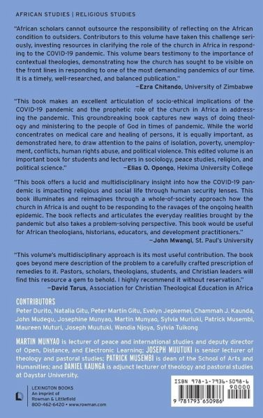 Introduction: Imagining of a Post-COVID-19 Church in Africa Martin Munyao Chapter 1: Understanding COVID-19 Disease and the Church in Africa: Infections, Containment, and Vaccines Natalia Gitu and Peter Martin Gitu Chapter 2: 'Can these Bones Live?': African Christianity and Human Security in Post-Covid-19 Era Chammah J. Kaunda Chapter 3: The Church and Food Security in the Post-COVID-19 Era: A Call for Decolonializing the African Mind Joseph Muutuki Chapter 4: Environmental Justice and the Church in Post-COVID-19 Era Peter Durito Chapter 5: Religious Diplomacy and Interstate Relations During COVID-19 Pandemic: Exploring Interfaith Engagements in Mediating for Peace and Harmony in the East African Region Martin Munyao and Maureen Muturi Chapter 6: The Church and Humanitarian Crisis in The Post-Covid-19 Era Sylvia Tuikong Chapter 7: The Church, Family, and Gender-Based Violence in the Post-COVID-19 Era Patrick Musembi, Joseph Muutuki, and Josephine Munyao Chapter