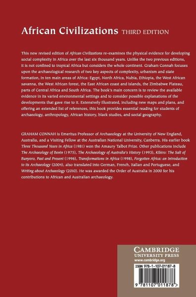 This new revised edition of African Civilizations re-examines the physical evidence for developing social complexity in Africa over the last six thousand years. Unlike the two previous editions, it is not confined to tropical Africa but considers the whole continent. Graham Connah focuses upon the archaeological research of two key aspects of complexity, urbanism and state formation, in ten main areas of Africa: Egypt, North Africa, Nubia, Ethiopia, the West African savanna, the West African forest, the East African coast and islands, the Zimbabwe Plateau, parts of Central Africa and South Africa. The book's main concern is to review the available evidence in its varied environmental settings, and to consider possible explanations of the developments that gave rise to it. Extensively illustrated, including new maps and plans, and offering an extended list of references, this is essential reading for students of archaeology, anthropology, African history, black studies and social geography.