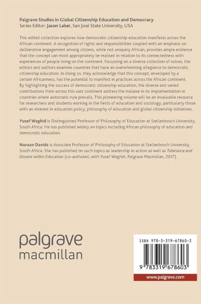 Chapter 1. On the Relevance of a Theory of Democratic Citizenship Education for Africa; Yusef Waghid.- Chapter 2. Democracy, Citizenship and Religion in Egypt: On the Necessity of Disrupting a post-Arab Spring; Nuraan Davids.- Chapter 3. Rethinking Democratic Citizenship Education in Africa: Towards Moderate Deliberation (Malawi and Namibia); Joseph Jinja Divala & Rachel Shanyanana.- Chapter 4. Afrophobia in the South African Higher Education System: A Threat to Internationalisation and Global Citizenship Initiatives; Joseph Pardon Hungwe & Joseph Jinja Divala.- Chapter 5. Nationalism and/or the Annihilation of Democratic Citizenship Education: A Critical Analysis of Zimbabwe's Citizenship Education Initiatives; Agrippa Chingombe & Joseph Jinja Divala.- Chapter 6. On the (Im)Possibility of Democratic Citizenship Education in Kenya: Spheres of Change; Jane Chiroma.- Chapter 7. (Re)Examining the Role of Technology in Education through a Deliberative Decision-Making Approach: In theQuest towards Democratic Education in South African Schools; Zayd Waghid & Faiq Waghid.- Chapter 8. The Politics of Schooling: Imagining Critical Democratic Citizenship Education in the Age of Neoliberalism (SA); Tracey Isaacs.- Chapter 9. Democratic Citizenship Education in Nigeria; Ruth Ayoola & Nuraan Davids.- Chapter 10. Democratic Citizenship Education Revisited in Zimbabwean Higher Education; Monica Zembere.- Chapter 11. Coda: Democratic Citizenship Education and Openness: On an Education of 'Bare Life'; Nuraan Davids & Yusef Waghid.