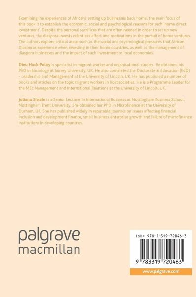 1. Introduction; Dieu Hack-Polay & Juliana Siwale.- Part I. Diaspora Direct Investment: Rationalities and Impact.- 2. Understanding Diaspora Transnationalism; Osa-Godwin Osaghae.- 3. Diaspora Investment and African National Economics: Case Studies; Gift Mugano.- 4. Mapping of Diaspora Direct Investment: Critical Areas of Investment; Juliana Siwale.- 5. Compassionate investment? Diaspora Contribution to Poverty Alleviation in Francophone West Africa; Dieu Hack-Polay.- Part II. Management of Diaspora Businesses.- 6. Diaspora Networks: A Social Capital Source for Entrepreneurship in Low-Income and Emerging Economies; Amon Simba & Nathanael Ojong.- 7. Transnational Diaspora Entrepreneurship: Do Local Social Networks in Home Country Matter?; Olu Aluko & Walter Mswaka.- 8. Diaspora Businesses in Africa: Survival and Sustainability; Sombo Muzata Chunda.- 9. Management of Diaspora Businesses: Issues and Learning; John Opute.- 10. Gender and Diaspora Investment: What Do We Know?; Roda Madziva, Juliana Siwale & Juliet Thondhlana.- 11. Skilled Migrant African Women of Faith and Diaspora Investment; Juliet Thondhlana & Roda Madziva.- 12. Conclusion; Juliet Siwale & Dieu Hack-Polay.