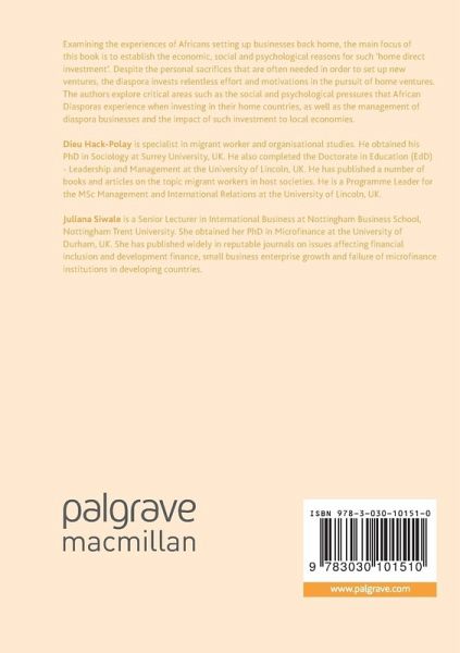 Examining the experiences of Africans setting up businesses back home, the main focus of this book is to establish the economic, social and psychological reasons for such 'home direct investment'. Despite the personal sacrifices that are often needed in order to set up new ventures, the diaspora invests relentless effort and motivations in the pursuit of home ventures. The authors explore critical areas such as the social and psychological pressures that African Diasporas experience when investing in their home countries, as well as the management of diaspora businesses and the impact of such investment to local economies.