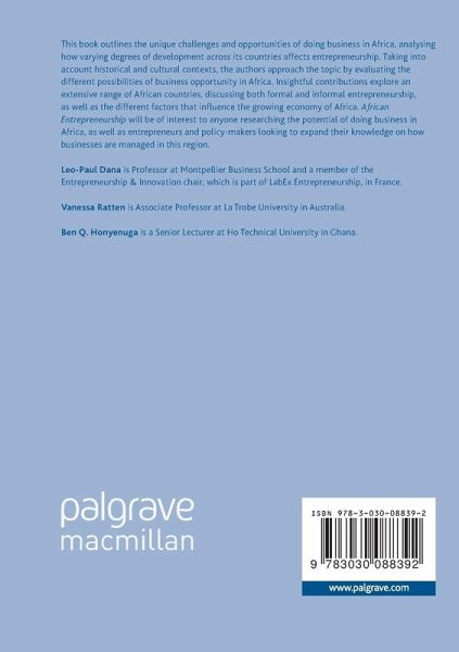 1. Introduction to African Entrepreneurship; Leo-Paul Dana, Vanessa Ratten and Ben Q. Honyenuga.- 2. Bringing Africa into Entrepreneurship Research; Vanessa Ratten and Paul Jones.- 3. Tanzania as an Emerging Entrepreneurial Ecosystem: Prospects and Challenges; Bella L. Galperin and Lemayon L. Melyoki.- 4. The Kenyan Environment's Influence on the Emergence and Development of Corporate Entrepreneurship among SMEs; Michael J. Mustafa and Mathew Hughes.- 5. Entrepreneurship Education in Developing Countries: A Study on Key Challenges in Sierra Leone; Alfred Mbeteh and Massimiliano M. Pellegrini.- 6. African Entrepreneurship: Constraints and Improvements; Gerd Junne.- 7. Entrepreneurial Opportunities and Challenges for Retired Senior Military Officers in Nigeria; Kaseem Ayasi and Nnamdi Madichie.- 8. Income Diversification and Banks' Profitability from an African Markets Perspective: A Relief for SMEs?; Isaac Boadi.- 9. Entrepreneurship and SMEs' Productivity Challenges in Sub-Saharan Africa; Paul Igwe, Adah Emmanuel Onjewu and Simon Uguru Nwibo.- 10. Entrepreneur-SME Manager Traits and Sources of Financing; Eniola Anthony Abiodun.- 11. Brokering: Africa's Unique Brand of Entrepreneurship; Daniel M. Quaye, Nkukpornu Atsu and George Acheampong.- 12. South Africa's White Entrepreneurs: An Evolution from Opportunity to Necessity; Warren Lloyd.- 13. Entrepreneurship Policy for the Health Sector in Rwanda: A Quest for Contextual Social Inclusion; Marcela Ramírez Pasillas, Hans Lundberg and Sabine Umuhire.