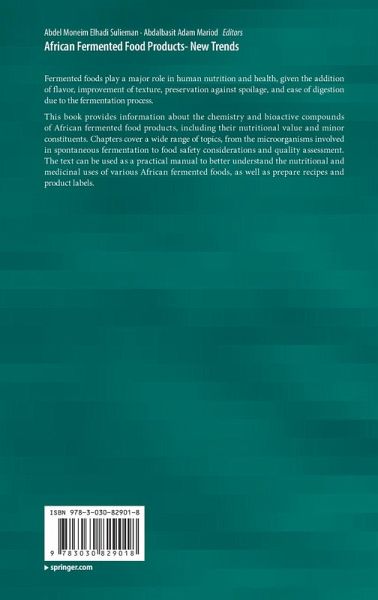 1 Introduction: Origin, history and diversity of African fermented foods. Abdel Moneim Elhadi Sulieman.- 2 Starter Cultures: nature, types, characteristics, preparation and maintenance Abdel Moneim Elhadi Sulieman.- 3 Properties and advantages of food fermentation Abdalbasit Mariod, Fatima, A. A. Massad.- 4 Significance of African Fermented Foods in Nutrition and Food Science Suzy Munir Salama, Abdalbasit Mariod.- 5 Microorganisms Involved in Spontaneous Fermentation and their health risk. Abdel Moneim Elhadi Sulieman.- 6 Probiotic Fermented Foods and Health Promotion Syed Amir Ashraf, Abd Elmoneim O. Elkhalifa, Md Faruque Ahmad, Mitesh Patel, Mohd Adnan and Abdel Moneim E. Sulieman.- 7 Molecular Techniques for Microbial Community Profiling of Fermented Foods. Nawaf Alshammari.- 8 Enzymes in food fermentations Arif Jamal Siddiqui, Ritu Singh, Sadaf Jahan, Mousa Alreshidi, Walid Sabri Hamadou, Andleeb Khan, Abrar Ahmad, Mitesh Patel, Abdelmusin Abdelgadir Abdelmuhsin, Abdel Moneim E.Sulieman, Mohd Adnan.- 9 Bioactive Components of Fermented Food Products Suzy Munir Salama and Abdalbasit Mariod.- 10 Transcriptome based characterization of interaction between fermenting microorganisms during production of bakery products Mitesh Patel, Malvi Surti, Arif Jamal Siddiqui, Mousa Alreshidi, Syed Amir Ashraf, Mohd Adnan.- 11 Quality evaluation of Semi-indigeous proceesed cheese (Gibna-beida) in Sudan Walied Abdelrahman Mustafa, Onaheid Ahmed Osman and Abdel Moneim Elhadi Sulieman.- 12 Nutritional, Antimicrobial and Bioactive components of Gariss, a fermented Camel milk product Abdel Moneim Elhadi Sulieman and Abdalla Ali Alayan.- 13 Production and Quality Assessment of Camel Milk Cheese. Salma Mahgoub and Abdel Moneim Elhadi Sulieman.- 14 Selected Fermented Fish Products of the Sudan Onaheid Ahmed Osman, Walied Abdelrahman Mustafa, and Abdel Moneim Elhadi Sulieman.- 15 Factors Influence the Quality and Safety of Fermented Sausages. Osman Ahmed Osman and Abdel Moneim Elhadi Sulieman.- 16 Technology of fermented mango juice production Coulibaly Wahauwouélé Hermann, Camara Fatoumata, Mian Tano Marie-Ange Sakia, Beugre Avit Grah Maxwell, Djè Koffi Marcellin.- 17 Fermented fish products in sub-Saharan Africa AYELOJA, Ayodeji Ahmed1 and *JIMOH, Wasiu Adeyemi2.- 18 African Fermented Vegetable Products Gustav Komla Mahunu and Abdalbasit Adam Mariod.- 19 Production and Evaluation of Vinegar Using Nabag as a Raw Material Abdel Moneim Elhadi Sulieman and Hiba Bokhari Yousif.- 20 Selected Fermented Cereal products of Sudan Abdel Moneim Elhadi Sulieman, Walied Abdelrahman Mustafa and Onaheid Ahmed Osman.- 21 Production and Quality Assessment of Hulu-mur Fermented Beverage. Abdel Moneim Elhadi Sulieman.- 22 Nutrient Composition and Bioactive Components of Non-Alcoholic Sorghum Malt Beverage Coulibaly Wahauwouélé Hermann, Camara Fatoumata, Mian Tano Marie-Ange Sakia, Beugre Avit Grah Maxwell, Djè Koffi Marcellin.- 23 Preparation of Soy milk Zabady and Assessment of its Quality Abdel Moneim Elhadi Sulieman*, Areej Mohamed Ali and Elamin Abdullah Elkhalifa.- 24 Nutrient Composition and Bioactive Components of Kejeik Zahra Mohamed Hassan Kush Kush, and Abdel Moneim Elhadi Sulieman.- 25 Nutrient Composition and Bioactive Components of Non-Alcoholic Sorghum Malt Beverage. Ahmed Gaafar Elgorashi and Abdel moneim E. Sulieman.- 26 Production and Quality Assessment of Kissra, a Sudanese fermented Sorghum Product Abdel Moneim Elhadi Sulieman and Eitimad Ali.- 27 Utilization of Gum Arabic as a thickener and Stabilizer in Production of the fermented milk Zabady Abdel Moneim E. Sulieman, Nawaf I. Alshammari, Nasir A Ibrahim and Sulaiman Alsalamah.- 28 Bioactive Components of Fermented Food Products: Phytochemicals, Phytosterol and vitamins Haroon Elrasheid Tahir, Zou Xiaobo, Mahunu Gustav Komla, Abdalbasit Mariod.- 29 Fermented Millet for Porridge Production: A Model for Improved Gastrointestinal Health Afoakwah A. Newlove, Gustav Komla Mahunu , Haroon Elrasheid Tahir.- 30 Fermented African Cereal Products Maurice Tibiru Apaliya, Richard Osae, Emmanuel Kwaw, Gustav Komla Mahunu, Mildred Osei-Kwarteng and Joseph Kwabena Ahima.- 31 Fermentation of Cocoa Bean.- Gustav Komla Mahunu , Newlove Akowuah Afoakwah , Abdalbasit Adam Mariod, Abdul Rashid Hudu and Haroon Elrasheid Tahir.- 32 Fermentation of Parkia biglobosa seeds: Effect of temperature conditions on Bioactive, Nutritive and Antioxidant Parameters Quansah Lydia, Gustav Komla Mahunu , Haroon Elrasheid Tahir.- 33 Improvement of Indigenous fermentation Technologies for Certain Ghanaian Fermented Foods Gustav Komla Mahunu, Newlove Akowuah Afoakwah, Abdul Rashid Hudu, Maurice Tibiru Apaliya.- 34 The quality aspect and safety of some traditional fermented product from sorghum and millet Newlove A. Afoakwah, Gustav Komla Mahunu and Mariod Adam Abdalbasit.- 35 Utilization of Jerusalem artichoke (Helianthus tuberosus L.) tuber as a prebiotic and a symbiotic Newlove Akowuah Afoakwah and Gustav Komla Mahunu.- 36 The nutritional and therapeutic benefits of some Nigerian fermented food products Fasogbon Beatrice Mofoluwaso, Ademuyiwa Oluwaseun Hannah and Bamidele Oluwaseun Peter.- 37 Omics in traditioanl foods and beverages Maurice Tibiru Apaliya, Richard Osae, Emmanuel Kwaw, Gustav Komla Mahunu, Mildred Osei-Kwarteng, Issah Mohammed Hardi.