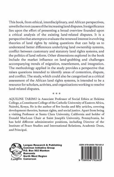 This book, from ethical, interdisciplinary, and African perspectives, unveils the root causes of the increasing land disputes. Its significance lies upon the effort of presenting a broad overview founded upon a critical analysis of the existing land-related disputes. It is a perspective that attempts to evaluate the renewed interest in evolving theories of land rights by raising questions that can help us to understand better differences underlying land ownership systems, conflict between customary and statutory land rights systems, and the politics of land reform. Other dimensions explored in the book include the market influence on land-grabbing and challenges accompanying trends of migration, resettlement, and integration. The methodology applied in the study provides a perspective that raises questions intended to identify areas of contention, dispute, and conflict. The study, which could also be categorized as a critical assessment of the African land rights systems, is intended to be a resource for scholars, activists, and organizations working to resolve land-related disputes.