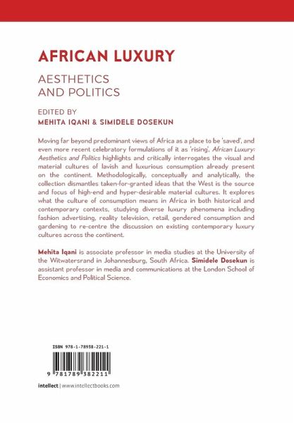 Moving far beyond predominant views of Africa as a place to be 'saved', and even more recent celebratory formulations of it as 'rising', African Luxury: Aesthetics and Politics highlights and critically interrogates the visual and material cultures of lavish and luxurious consumption already present on the continent. A PDF version of this book is available for free in Open Access: African Luxury. It has been made available under a Creative Commons Attribution 4.0 International Public Licence and is part of Knowledge Unlatched.