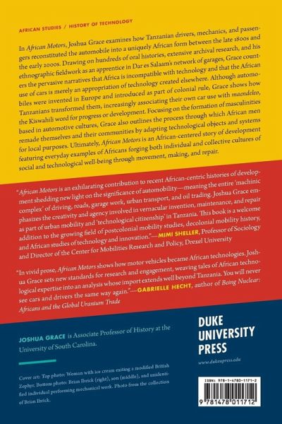 In African Motors, Joshua Grace examines how Tanzanian drivers, mechanics, and passengers reconstituted the automobile into a uniquely African form between the late 1800s and the early 2000s. Drawing on hundreds of oral histories, extensive archival research, and his ethnographic fieldwork as an apprentice in Dar es Salaam's network of garages, Grace counters the pervasive narratives that Africa is incompatible with technology and that the African use of cars is merely an appropriation of technology created elsewhere. Although automobiles were invented in Europe and introduced as part of colonial rule, Grace shows how Tanzanians transformed them, increasingly associating their own car use with maendeleo, the Kiswahili word for progress or development. Focusing on the formation of masculinities based in automotive cultures, Grace also outlines the process through which African men remade themselves and their communities by adapting technological objects and systems for local purposes. Ultimately, African Motors is an African-centered story of development featuring everyday examples of Africans forging both individual and collective cultures of social and technological wellbeing through movement, making, and repair.