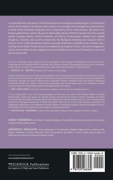In the last fifty years, the history of World Christianity has been disproportionally shaped, if not defined, by African Pentecostalism. The objective of this volume is to investigate and interrogate the critical junctures at which World Christianity invigorates and is invigorated by African Pentecostalism. The essays of the thinkers gathered here examine the general relationships between World Christianity and Africa and the specific interplays between World Christianity and African Pentecostalism. Scholars from multiple disciplines, continents, and countries evaluate how the theological scholarship and missional works of eminent African intellectual Johnson Kwabena Asamoah-Gyadu have contributed to the scholarly understanding of how Global Christianity has been mediated by its reception in Africa. They also investigate how African Pentecostalism has been shaped by its contact with the diverse forms of Christianity in Africa and the rest of the world. With contributions from: Opoku Onyinah Harvey C. Kwiyani Kirsteen Kim Craig S. Keener Charles Prempeh Kenneth R. Ross Trevor H. G. Smith Vivian Dzokoto Chammah J. Kaunda Felix Kang Esoh Patrick Kofi Amissah Caleb Nyanni Marleen de Witte Oluwaseun Abimbola Philomena Njeru Nwaura Faith Lugazia Dietrich Werner Allan H. Anderson