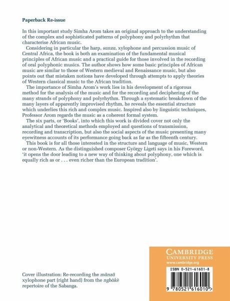 In this detailed study Simha Arom takes a new and original approach to the understanding of the complex and sophisticated patterns of polyphony and polyrhythm that characterise African music. Considering in particular the harp, sanza, xylophone and percussion music of Central Africa, Simha Arom develops a rigorous method for the analysis of the music and for the recording and deciphering of the many strands of polyphony and polyrhythm. Through a systematic breakdown of the many layers of apparently improvised rhythm he reveals the essential structure which underlies this rich and complex music. Inspired also by linguistic techniques, Professor Arom regards the music very much as a grammatical system.