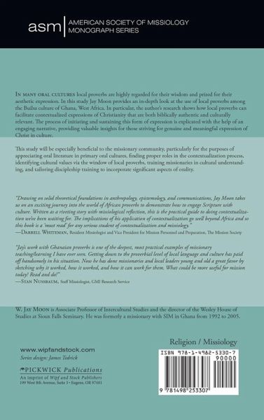 In many oral cultures local proverbs are highly regarded for their wisdom and prized for their aesthetic expression. In this study Jay Moon provides an in-depth look at the use of local proverbs among the Builsa culture of Ghana, West Africa. In particular, the author's research shows how local proverbs can facilitate contextualized expressions of Christianity that are both biblically authentic and culturally relevant. The process of initiating and sustaining this form of expression is explicated with the help of an engaging narrative, providing valuable insights for those striving for genuine and meaningful expression of Christ in culture. This study will be especially beneficial to the missionary community, particularly for the purposes of appreciating oral literature in primary oral cultures, finding proper roles in the contextualization process, identifying cultural values via the window of local proverbs, training missionaries in cultural understanding, and tailoring discipleship training to incorporate significant aspects of orality