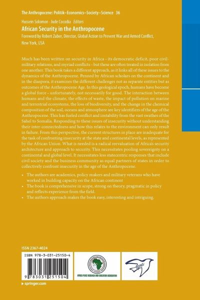 Much has been written on security in Africa-its democratic deficit, poor civil-military relations, and myriad conflicts-but these are often treated in isolation from one another. This book takes a different approach, as it links all of these issues to the dynamics of the Anthropocene. Penned by African scholars on the continent and in the diaspora, it examines the different challenges not as separate entities but as outcomes of the Anthropocene Age. In this geological epoch, humans have become a global force-unfortunately, not necessarily for good. The interaction between humans and the climate, the effects of waste, the impact of pollution on marine and terrestrial ecosystems, the loss of biodiversity, and the change in the chemical composition of the soil, oceans and atmosphere are key identifiers of the age of the Anthropocene. This has fueled conflict and instability from the vast swathes of the Sahel to Somalia. Responding to these issues of insecurity without understanding their inter-connectedness and how this relates to the environment can only result in failure. From this perspective, the current structures in place are inadequate for the task of confronting insecurity at the state and continental levels, as represented by the African Union. What is needed is a radical reevaluation of Africa's security architecture and approach to security. This necessitates pooling sovereignty on a continental and global level. It necessitates less state-centric responses that include civil society and the business community as equal partners of states in order to collectively confront insecurity in the age of the Anthropocene.