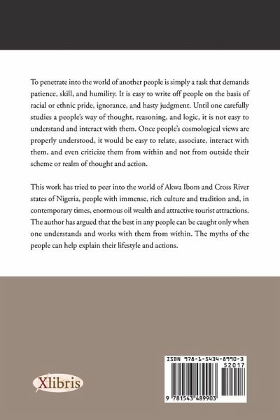 To penetrate into the world of another people is simply a task that demands patience, skill, and humility. It is easy to write off people on the basis of racial or ethnic pride, ignorance, and hasty judgment. Until one carefully studies a peoples way of thought, reasoning, and logic, it is not easy to understand and interact with them. Once peoples cosmological views are properly understood, it would be easy to relate, associate, interact with them, and even criticize them from within and not from outside their scheme or realm of thought and action. This work has tried to peer into the world of Akwa Ibom and Cross River states of Nigeria, people with immense, rich culture and tradition and, in contemporary times, enormous oil wealth and attractive tourist attractions. The author has argued that the best in any people can be caught only when one understands and works with them from within. The myths of the people can help explain their lifestyle and actions.