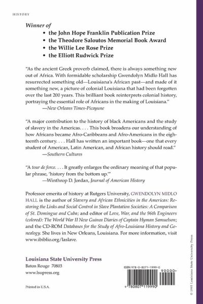 Although a number of important studies of American slavery have explored the formation of slave cultures in the English colonies, no book until now has undertaken a comprehensive assessment of the development of the distinctive Afro-Creole culture of colonial Louisiana. This culture, based upon a separate language community with its own folkloric, musical, religious, and historical traditions, was created by slaves brought directly from Africa to Louisiana before 1731. It still survives as the acknowledged cultural heritage of tens of thousands of people of all races in the southern part of the state. In this pathbreaking work, Gwendolyn Midlo Hall studies Louisiana's creole slave community during the eighteenth century, focusing on the slaves' African origins, the evolution of their own language and culture, and the role they played in the formation of the broader society, economy, and culture of the region. Hall bases her study on research in a wide range of archival sources in Louisiana, France, and Spain and employs several disciplines--history, anthropology, linguistics, and folklore--in her analysis. Among the topics she considers are the French slave trade from Africa to Louisiana, the ethnic origins of the slaves, and relations between African slaves and native Indians. She gives special consideration to race mixture between Africans, Indians, and whites; to the role of slaves in the Natchez Uprising of 1729; to slave unrest and conspiracies, including the Pointe Coupee conspiracies of 1791 and 1795; and to the development of communities of runaway slaves in the cypress swamps around New Orleans. Hall's text is enhanced by a number of tables, graphs, maps, and illustrations.Hall attributes the exceptional vitality of Louisiana's creole slave communities to several factors: the large size of the African population relative to the white population; the importation of slaves directly from Africa; the enduring strength of African cultural features in the s