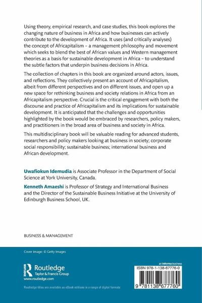 Using theory, empirical research, and case studies, this book explores the changing nature of business in Africa and how businesses can actively contribute to the development of Africa. It uses (and critically analyses) the concept of Africapitalism - a management philosophy and movement which seeks to blend the best of African values and Western management theories as a basis for sustainable development in Africa - to understand the subtle factors that underpin business decisions in Africa. The collection of chapters in this book are organized around actors, issues, and reflections. They collectively present an account of Africapitalism, albeit from different perspectives and on different issues, and open up a new space for rethinking business and society relations in Africa from an Africapitalism perspective. Crucial is the critical engagement with both the discourse and practice of Africapitalism and its implications for sustainable development. It is anticipated that the challenges and opportunities highlighted by the book would be embraced by researchers, policy makers, and practitioners in the broad area of business and society in Africa. This multidisciplinary book will be valuable reading for advanced students, researchers and policymakers looking at business in society; corporate social responsibility; sustainable business; international business and African development.