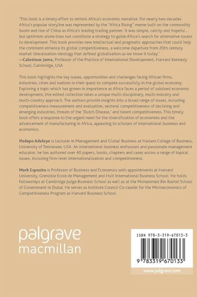 1. Africa's Competitiveness in the Global Economy: Past, Present and Future; Ifedapo Adeleye, Joseph Amankwah-Amoah, Nathaniel Boso and Mark Esposito.- Part I. The Global Competitiveness of African Nations and Cities.- 2. The Competitive Challenge of the Formal Sector in Francophone Africa: Understanding the Role of the Informal Sector and the Business Environment; Ahmadou Aly Mbaye and Fatou Gueye.- 3. Theorizing Cities as Sources of Competitive Advantage: Accra in Comparative Perspective; George Acheampong and Obi Berko Damoah.- 4. The International Competitiveness and Connections of African Cities: Profiling South Africa's Gauteng-City Region; Joseph Parilla and Jesus Leal Trujillo.- Part II. Sectorial Dynamics and International Competitiveness in Africa.- 5. Banking on Africa: Can Emerging Pan-African Banks Outcompete their Global Rivals?; Ifedapo Adeleye, Franklin Ngwu, Nkemdilim Iheanachor, Ebes Esho, Chijioke Oji, Theresa Onaji-Benson and Chris Ogbechie.- 6. Enhancing TourismCompetitiveness in Sub-Saharan Africa: Emerging Trends, Challenges and Strategies; Adun Okupe, Trevor Ward and Ogechi Adeola.- 7. Measurement of Agribusiness Competitiveness: Methods and Applications to African Countries; Suresh Chandra Babu and Mahika Shishodia.- 8. Why are so Many African Companies Uncompetitive on the Globe Stage? Insights from the Global Airline Industry; Joseph Amankwah-Amoah.- Part III. Human Capital and International Competitiveness in Africa.- 9. Human Capital, innovation and International Competitiveness in Sub-Saharan Africa; Yaw Debrah, Oriacghe Oseghale and Kweku Adams.- 10. Improving Africa's Competitiveness through Strategic Knowledge Transfer: Lessons from Partnerships with China and Ways Forward; Abdoulkadre Ado.- Part IV: Cases on the Global Competitiveness of Africa's Economic Powerhouses.- 11. Nigeria: Oil and Competitiveness; Doyin Salami, Malcolm Fabiyi and Ifedapo Adeleye.- 12. The South African Renewable Energy Cluster; Mark Esposito, Months Raut, Laura Lanzoni Broccoli, Nasma Harrachi, Yann Claudel, Yang Yang and Melina Balliard.- 13. Kenya's Blooming Flower Industry: Enhancing Global Competitiveness; Ogechi Adeola, Abel Kinoti and Mary Kinoti.- 14. Poultry Tariffs in South Africa: Levelling the Playing Field or Rewarding Inefficiency?; Jacklynne Hobbs, Peter Draper and Claire Beswick.