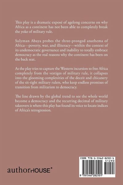 This play is a dramatic exposé of agelong concerns on why Africa as a continent has not been able to completely break the yoke of military rule. Sulyman Abaya probes the three-pronged anathema of Africa-poverty, war, and illiteracy-within the context of its undemocratic governance and inability to totally embrace democracy as the real reasons why the continent has been on the back seat. As the play tries to capture the Western incursion to free Africa completely from the vestiges of military rule, it collapses into the glooming complexities of the deceit and chicanery of the sit-tight military rulers, who keep endless promises of transition from militarism to democracy. The line drawn by the global trend to see the whole world become a democracy and the recurring decimal of military takeovers is where this play has found its voice to locate indices of Africa's retrogression.