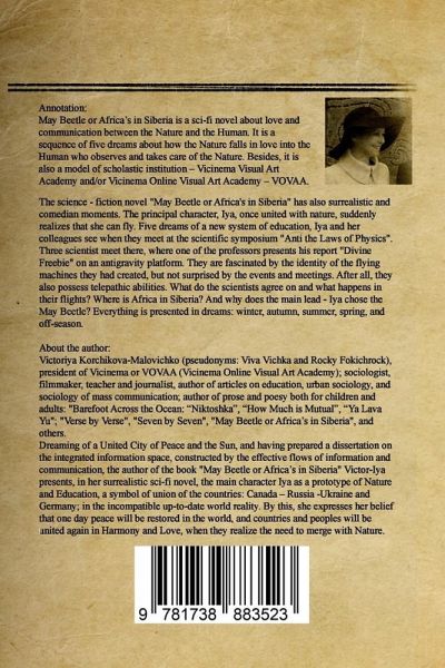 May Beetle or Africa's in Siberia is a sci-fi novel about love and communication between the Nature and the Human. It is a sequence of five dreams about how the Nature falls in love into the Human who observes and takes care of the Nature. Besides, it is also a model of scholastic institution - Vicinema Visual Art Academy and/or Vicinema Online Visual Art Academy - VOVAA. The science - fiction novel "May Beetle or Africa's in Siberia" has also surrealistic and comedian moments. The principal character, Iya, once united with nature, suddenly realizes that she can fly. Five dreams of a new system of education, Iya and her colleagues see when they meet at the scientific symposium "Anti the Laws of Physics". Three scientist meet there, where one of the professors presents his report "Divine Freebie" on an antigravity platform. They are fascinated by the identity of the flying machines they had created, but not surprised by the events and meetings. After all, they also possess telepathic abilities. What do the scientists agree on and what happens in their flights? Where is Africa in Siberia? And why does the main lead - Iya chose the May Beetle? Everything is presented in dreams: winter, summer, spring, autumn, and off-season.