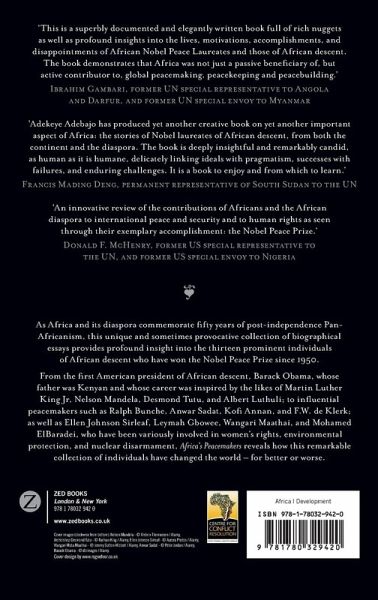 Part I: Introduction 1. Obama's Nobel Ancestors: From Bunche to Barack and Beyond - Adekeye Adebajo 2. Barack Obama: Between Racial Compatriots and Nobel Ancestors - Ali A. Mazrui Part II: The Three African-Americans 3. Ralph Bunche: The Scholar-Diplomat - James Jonah 4. Martin Luther King, Jr.: The Great Provocateur - Lee A. Daniels 5. Ralph Bunche, Martin Luther King, Jr., and Barack Obama: Three African-American Nobel Laureates Debate War and Peace - Pearl Robinson Part III: The Four South Africans 6. Albert Luthuli: The African Moses - Chris Saunders 7. Desmond Tutu: The Wounded Healer - Maureen Isaacson 8. Nelson Mandela: The Oratory of the Black Pimpernel - Elleke Boehmer 9. Frederik Willem de Klerk: The Pragmatic Peacemaker - Gregory Houston Part IV: The Two Egyptians 10. Anwar Sadat: The Tragic Peacemaker - Boutros Boutros-Ghali 11. Mohamed El-Baradei: The Rocket Man - Morad Abou-Sabé Part V: The Kenyan and the Ghanaian 12. Wangari Maathai: The Earth Mother - Janice Golding 13. Kofi Annan: The Soft-Spoken Prophet - Gwendolyn Mikell Part VI: The Two Liberians 14. Ellen Johnson Sirleaf: The Iron Lady - Adekeye Adebajo 15. Leymah Gbowee: The Prayerful Peace Warrior - Rosaline Daniel