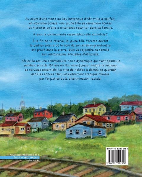 A¿ quoi ressemblait la communaute¿? Des maisons aux couleurs vives, loge¿es dans la colline ; des champs oü les garc¿ons jouaient au football; un e¿tang oü les en- fants faisaient du rafting; la pe¿che en abondance; des immenses feux de joie... La jeune fille sort de sa re¿verie; elle visite le parc historique actuel et le cadran solaire oü le nom de son arrie¿re-grand me¿re est grave¿ dans la pierre, et ce¿le¿bre un jour d'e¿te¿ aux retrouvailles annuelles d'Africville.