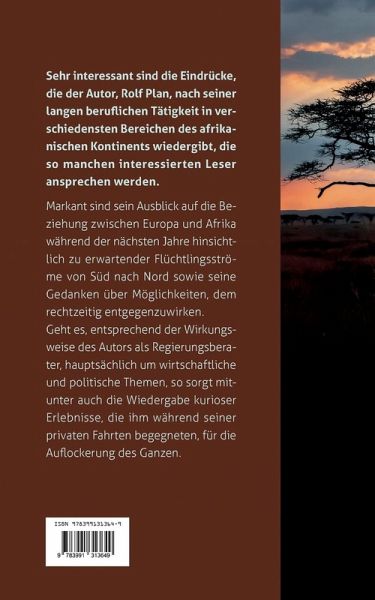 Sehr interessant sind die Eindrücke, die der Autor, Rolf Plan, nach seiner langen beruflichen Tätigkeit in verschiedensten Bereichen des afrikanischen Kontinents wiedergibt, die so manchen interessierten Leser ansprechen werden. Markant sind sein Ausblick auf die Beziehung zwischen Europa und Afrika während der nächsten Jahre hinsichtlich zu erwartender Flüchtlingsströme von Süd nach Nord sowie seine Gedanken über Möglichkeiten, dem rechtzeitig entgegenzuwirken.Geht es, entsprechend der Wirkungsweise des Autors als Regierungsberater, hauptsächlich um wirtschaftliche und politische Themen, so sorgt mitunter auch die Wiedergabe kurioser Erlebnisse, die ihm während seiner privaten Fahrten begegneten, für die Auflockerung des Ganzen.