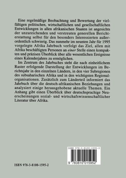 Erläuterungen zu den Grunddaten.- Abkürzungsverzeichnis.- Afrika 1995 - Das Jahr im Überblick.- Deutsch-afrikanische Beziehungen 1995.- Aktuelle Einzelanalysen.- Der Ogoni-Shell-Komplex: Zur Geschichte einer Grass-Roots-Bewegung.- Das Commonwealth in Afrika.- Die Frankophonie oder Warum Gott in Afrika Französisch spricht.- Militärs und Demokraten. Der Einfluß des Militärs auf Demokratisierungs- und Staatszerfallsprozesse.- Bodenordnung und ländliche Entwicklung in Afrika südlich der Sahara.- Entwicklungen in Ländern und Regionen.- Westafrika.- Benin.- Burkina Faso.- Côte d'Ivoire.- Gambia.- Ghana.- Guinea.- Guinea-Bissau.- Kap Verde.- Liberia.- Mali.- Mauretanien.- Niger.- Nigeria.- Senegal.- Sierra Leone.- Togo.- Zentralafrika.- Äquatorial-Guinea.- Gabun.- Kamerun.- Kongo.- São Tomé und Príncipe.- Tschad.- Zaire.- Zentralafrikanische Republik.- Östliches Afrika.- Äthiopien.- Burundi.- Djibouti.- Eritrea.- Kenya.- Komoren.- Madagaskar.- Mauritius.- Réunion.- Rwanda.- Seychellen.- Somalia.- Sudan.- Tanzania.- Uganda.- Südliches Afrika.- Angola.- Botswana.- Lesotho.- Malawi.- Mosambik.- Namibia.- Südafrika.- Swaziland.- Zambia.- Zimbabwe.- Neuerscheinungen deutschsprachiger Bücher über Afrika.- Angaben zu den Autoren/Autorinnen.
