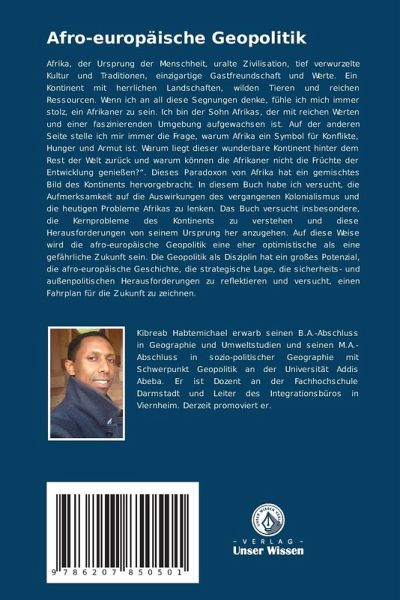 Afrika, der Ursprung der Menschheit, uralte Zivilisation, tief verwurzelte Kultur und Traditionen, einzigartige Gastfreundschaft und Werte. Ein Kontinent mit herrlichen Landschaften, wilden Tieren und reichen Ressourcen. Wenn ich an all diese Segnungen denke, fühle ich mich immer stolz, ein Afrikaner zu sein. Ich bin der Sohn Afrikas, der mit reichen Werten und einer faszinierenden Umgebung aufgewachsen ist. Auf der anderen Seite stelle ich mir immer die Frage, warum Afrika ein Symbol für Konflikte, Hunger und Armut ist. Warum liegt dieser wunderbare Kontinent hinter dem Rest der Welt zurück und warum können die Afrikaner nicht die Früchte der Entwicklung genießen?". Dieses Paradoxon von Afrika hat ein gemischtes Bild des Kontinents hervorgebracht. In diesem Buch habe ich versucht, die Aufmerksamkeit auf die Auswirkungen des vergangenen Kolonialismus und die heutigen Probleme Afrikas zu lenken. Das Buch versucht insbesondere, die Kernprobleme des Kontinents zu verstehen und dieseHerausforderungen von seinem Ursprung her anzugehen. Auf diese Weise wird die afro-europäische Geopolitik eine eher optimistische als eine gefährliche Zukunft sein. Die Geopolitik als Disziplin hat ein großes Potenzial, die afro-europäische Geschichte, die strategische Lage, die sicherheits- und außenpolitischen Herausforderungen zu reflektieren und versucht, einen Fahrplan für die Zukunft zu zeichnen.