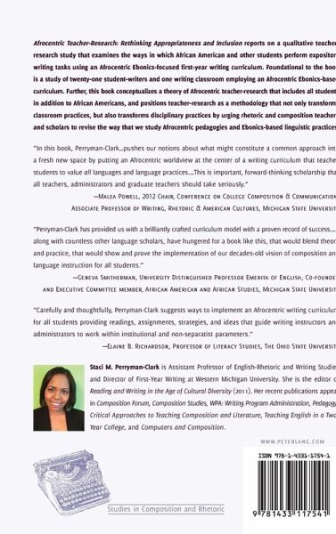 «In this book, Perryman-Clark [...] pushes our notions about what might constitute a common approach into a fresh new space by putting an Afrocentric worldview at the center of a writing curriculum that teaches students to value 'all' languages and language practices. [...] This is important, forward-thinking scholarship that all teachers, administrators and graduate teachers should take seriously.» (Malea Powell, 2012 Chair, Conference on College Composition & Communication; Associate Professor of Writing, Rhetoric & American Cultures, Michigan State University)