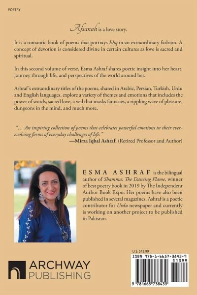 Afsanah is a love story. It is a romantic book of poems that portrays Ishq in an extraordinary fashion. A concept of devotion is considered divine in certain cultures as love is sacred and spiritual. In this second volume of verse, Esma Ashraf shares poetic insight into her heart, journey through life, and perspectives of the world around her. Ashraf's extraordinary titles of the poems, shared in Arabic, Persian, Turkish, Urdu and English languages, explore a variety of themes and emotions that includes the power of words, sacred love, a veil that masks fantasies, a rippling wave of pleasure, dungeons in the mind, and much more. "... An inspiring collection of poems that celebrates powerful emotions in their ever-evolving forms of everyday challenges of life." -Mirza Iqbal Ashraf, (Retired Professor and Author)