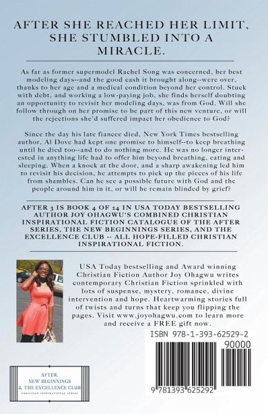 Christian Inspirational Fiction - Book 4 of 24. By a USA Today bestselling author. After she reached her limit, she stumbled into a miracle. A down-on-his-luck renowned author in hiding, stumbles into a forgotten Christian supermodel in crisis, on Day Spring Farms. What could go wrong-or right? As far as former supermodel Rachel Song was concerned, her best modeling days--and the good cash it brought along--were over, thanks to her age and a medical condition beyond her control. Stuck with debt, and working a low-paying job, she finds herself doubting an opportunity to revisit her modeling days, was from God. Will she follow through on her promise to be part of this new venture, or will the rejections she'd suffered impact her obedience to God? Since the day his late fiancee died, New York Times bestselling author, Al Dove had kept one promise to himself--to keep breathing until he died too--and to do nothing more. He was no longer interested in anything life had to offer him beyond breathing, eating and sleeping. When a knock at the door, and a sharp awakening led him to revisit his decision, he attempts to pick up the pieces of his life from shambles. Can he see a possible future with God and the people around him in it, or will he remain blinded by grief? AFTER 3 is Book 4 of 24 in USA Today bestselling author Joy Ohagwu's combined Christian Inspirational Fiction catalogue of the After Series, the New Beginnings Series, and the Excellence Club -- All hope-filled Christian Inspirational Fiction. Enjoy all Twenty-Four books Today!