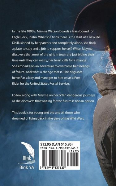In the late 1800’s, Mayme Watson boards a train bound for Eagle Rock, Idaho. What she finds there is the start of a new life. Disillusioned by her parents and completely alone, she finds a place to stay and a job to support herself. When Mayme discovers that most of the girls in town are just biding their time until they can marry, her heart calls for a change. She embarks on an adventure to overcome her feelings of failure. And what a change that is. She disguises herself as a boy and manages to hire on as a Post Rider for the United States Postal Service. Follow along with Mayme on her often dangerous journeys as she discovers that waiting for the future is not an option. This book is for young and old and all those who dreamed of living back in the days of the Wild West.