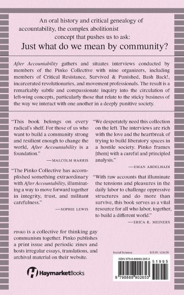 An oral history and critical genealogy of "accountability," the complex abolitionist concept that pushes us to ask: just what do we mean by "community?" A concept just short of a program, accountability has been taken up as a core principle within leftist organizing and activity over the past quarter century. While it invokes a particular vocabulary and set of procedures, it has also come to describe a more expansive, if often vague, approach to addressing harm within movement work. The term's sudden, widespread adoption as abolitionist concepts began to circulate broadly in recent years cast light on certain shifts in its meaning, renewing the urgency of understanding its relation to militant leftist history and practice. After Accountability gathers interviews conducted by members of the Pinko collective with nine transformative justice practitioners, socialist labor organizers, incarcerated abolitionists, and activists on the left, and also includes framing essays by the Pinko collective in which its members situate and reflect on those illuminating conversations. An investigation into the theoretical foundations and current practice of accountability, this volume explores the term's potential and limits, discovering in it traces of the past half-century's struggles over the absence of community and the form revolutionary activity should take. Contributors: Kim Diehl, Michelle Foy, Peter Hardie, Emi Kane and Hyejin Shim, Esteban Kelly, Pilar Maschi, and Stevie Wilson, and Pinko collective members Lou Cornum, Max Fox, M.E. O'Brien, and Addison Vawters.