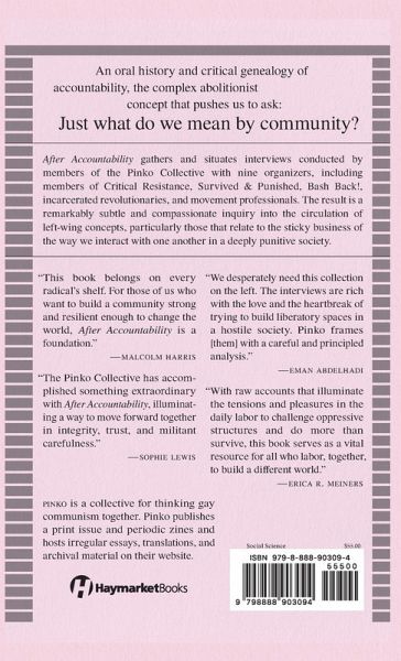 An oral history and critical genealogy of "accountability," the complex abolitionist concept that pushes us to ask: just what do we mean by "community?" A concept just short of a program, accountability has been taken up as a core principle within leftist organizing and activity over the past quarter century. While it invokes a particular vocabulary and set of procedures, it has also come to describe a more expansive, if often vague, approach to addressing harm within movement work. The term's sudden, widespread adoption as abolitionist concepts began to circulate broadly in recent years cast light on certain shifts in its meaning, renewing the urgency of understanding its relation to militant leftist history and practice. After Accountability gathers interviews conducted by members of the Pinko collective with nine transformative justice practitioners, socialist labor organizers, incarcerated abolitionists, and activists on the left, and also includes framing essays by the Pinko collective in which its members situate and reflect on those illuminating conversations. An investigation into the theoretical foundations and current practice of accountability, this volume explores the term's potential and limits, discovering in it traces of the past half-century's struggles over the absence of community and the form revolutionary activity should take. Contributors: Kim Diehl, Michelle Foy, Peter Hardie, Emi Kane and Hyejin Shim, Esteban Kelly, Pilar Maschi, and Stevie Wilson, and Pinko collective members Lou Cornum, Max Fox, M.E. O'Brien, and Addison Vawters.