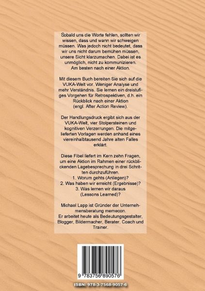 Sobald uns die Worte fehlen, sollten wir wissen, dass und wann wir schweigen müssen. Was jedoch nicht bedeutet, dass wir uns nicht darum bemühen müssen, unsere Sicht klarzumachen. Dabei ist es unmöglich, nicht zu kommunizieren. Am besten nach einer Aktion.Mit diesem Buch bereiten Sie sich auf die VUKA-Welt vor. Weniger Analyse und mehr Verständnis. Sie lernen ein dreistufiges Vorgehen für Retrospektiven, d.h. ein Rückblick nach einer Aktion (engl. After Action Review).Der Handlungsdruck ergibt sich aus der VUKA-Welt, vier Stolpersteinen und kognitiven Verzerrungen. Die mitgelieferten Vorlagen werden anhand eines viereinhalbtausend Jahre alten Falles erklärt.Diese Fibel liefert im Kern zehn Fragen, um eine Aktion im Rahmen einer rückblickenden Lagebesprechung in drei Schritten durchzuführen. 1. Worum gehts (Anliegen)? 2. Was haben wir erreicht (Ergebnisse)? 3. Was lernen wir daraus (Lessons Learned)?Michael Lapp ist Gründer der Unternehmensberatung memecon. Er arbeitet heute als Bedeutungsgestalter, Blogger, Bildermacher, Berater, Coach und Trainer.