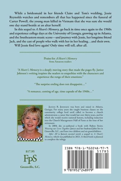 While a bridesmaid in her friends Claire and Tom's wedding, Jessie Reynolds watches and remembers all that has happened since the funeral of Carter Powell, the young man killed in Vietnam that she was sure she would one day stand beside at an altar herself. In this sequel to A Heart's Memory, go back in time once again to the 1960s and experience college days at the University of Georgia, growing up in Atlanta, and the Southeastern music scene-and journey with Jessie, her longtime friend Jack, and the cast of people who walk with her in her healing...and their own. Will Jessie find love again? Only time will tell, after all.