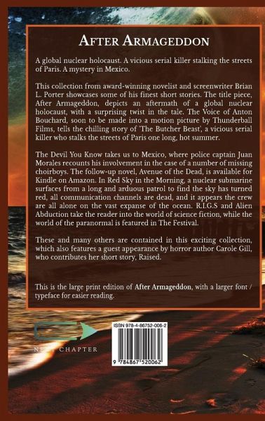 A global nuclear holocaust. A vicious serial killer stalking the streets of Paris. A mystery in Mexico. This collection from award-winning novelist and screenwriter Brian L. Porter showcases some of his finest short stories. The title piece, After Armageddon, depicts an aftermath of a global nuclear holocaust, with a surprising twist in the tale. The Voice of Anton Bouchard, soon to be made into a motion picture by Thunderball Films, tells the chilling story of 'The Butcher Beast', a vicious serial killer who stalks the streets of Paris one long, hot summer. The Devil You Know takes us to Mexico, where police captain Juan Morales recounts his involvement in the case of a number of missing choirboys. The follow-up novel, Avenue of the Dead, is available for Kindle on Amazon. In Red Sky in the Morning, a nuclear submarine surfaces from a long and arduous patrol to find the sky has turned red, all communication channels are dead, and it appears the crew are all alone on the vast expanse of the ocean. R.I.G.S and Alien Abduction take the reader into the world of science fiction, while the world of the paranormal is featured in The Festival. These and many others are contained in this exciting collection, which also features a guest appearance by horror author Carole Gill, who contributes her short story, Raised. This is the large print edition of After Armageddon, with a larger font / typeface for easier reading.