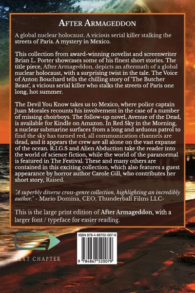 A global nuclear holocaust. A vicious serial killer stalking the streets of Paris. A mystery in Mexico. This collection from award-winning novelist and screenwriter Brian L. Porter showcases some of his finest short stories. The title piece, After Armageddon, depicts an aftermath of a global nuclear holocaust, with a surprising twist in the tale. The Voice of Anton Bouchard, soon to be made into a motion picture by Thunderball Films, tells the chilling story of 'The Butcher Beast', a vicious serial killer who stalks the streets of Paris one long, hot summer. The Devil You Know takes us to Mexico, where police captain Juan Morales recounts his involvement in the case of a number of missing choirboys. The follow-up novel, Avenue of the Dead, is available for Kindle on Amazon. In Red Sky in the Morning, a nuclear submarine surfaces from a long and arduous patrol to find the sky has turned red, all communication channels are dead, and it appears the crew are all alone on the vast expanse of the ocean. R.I.G.S and Alien Abduction take the reader into the world of science fiction, while the world of the paranormal is featured in The Festival. These and many others are contained in this exciting collection, which also features a guest appearance by horror author Carole Gill, who contributes her short story, Raised. This is the large print edition of After Armageddon, with a larger font / typeface for easier reading.