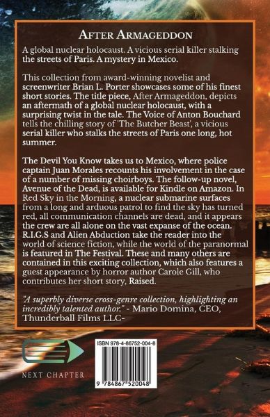 A global nuclear holocaust. A vicious serial killer stalking the streets of Paris. A mystery in Mexico. This collection from award-winning novelist and screenwriter Brian L. Porter showcases some of his finest short stories. The title piece, After Armageddon, depicts an aftermath of a global nuclear holocaust, with a surprising twist in the tale. The Voice of Anton Bouchard, soon to be made into a motion picture by Thunderball Films, tells the chilling story of 'The Butcher Beast', a vicious serial killer who stalks the streets of Paris one long, hot summer. The Devil You Know takes us to Mexico, where police captain Juan Morales recounts his involvement in the case of a number of missing choirboys. The follow-up novel, Avenue of the Dead, is available for Kindle on Amazon. In Red Sky in the Morning, a nuclear submarine surfaces from a long and arduous patrol to find the sky has turned red, all communication channels are dead, and it appears the crew are all alone on the vast expanse of the ocean. R.I.G.S and Alien Abduction take the reader into the world of science fiction, while the world of the paranormal is featured in The Festival. These and many others are contained in this exciting collection, which also features a guest appearance by horror author Carole Gill, who contributes her short story, Raised.